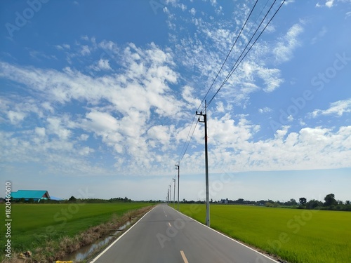 road, street, highway, landscape, scenery, view, countryside, rural, nature, outdoors, horizon, sky, atmosphere, cloud, blue, serenity, calmness, field, grass, greenery, farmland, cultivated, open, roomy, expansive, powerline, infrastructure, development, building, structure, small, shelter, environment, richness, vitality