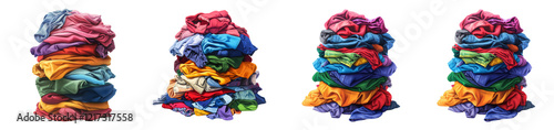 The image depicts four separate piles of multicolored clothing, each exhibiting a variety of fabrics and shades.