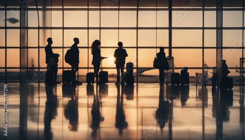 The image depicts silhouettes of passengers waiting in front of a window at an airport and on an air