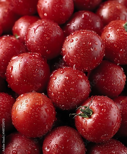 display, large, group, small, round, red, produce, appearing, washed, covered, dew, numerous, water, droplet, cling, smooth, surface, reflecting, light, adding, their, fresh, appearance, densely, packed, together, varying, degree, visibility, depth, field, few, stem, visible, touch, green, composition, fruit, food, berry, cranberry, ripe, healthy, isolated, cherry, sweet, nature
