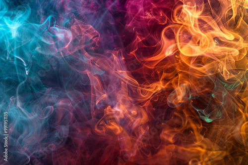The image is a colorful smokey background with a blue and orange swirl