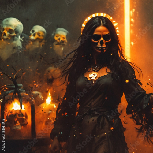 The image is of a powerful and beautiful witch. She is standing in a dark and mysterious place, surrounded by skulls and flames.