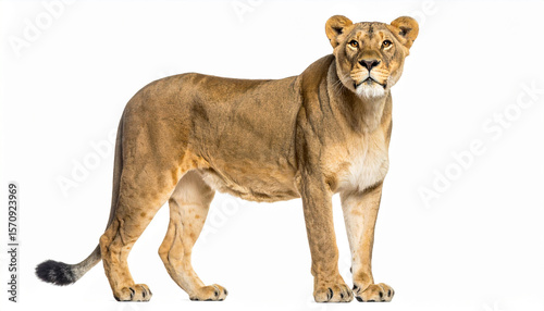 its, present, large, tawny, coloured, cat, standing, neutral, white, space, animal, captured, full, profile, displaying, powerful, build, muscular, frame, coat, sleek, unmarked, thick, neck, lead, well, defined, face, tail