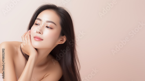 The image showcases a young Asian woman with a serene expression, touching her face gently.