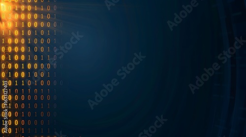 The image shows a digital background with glowing orange binary code, consisting of zeros and ones, floating against a dark blue space, creating a futuristic technological vibe.