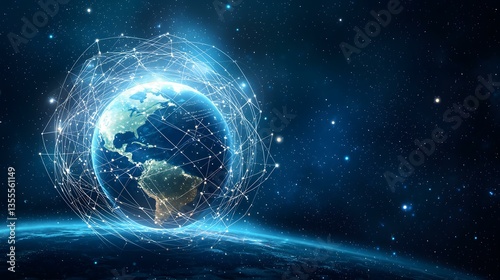 The image shows a digitally enhanced view of planet Earth, centered on the Americas, enveloped by a glowing network of interconnected lines resembling a global communication or data network. The sce
