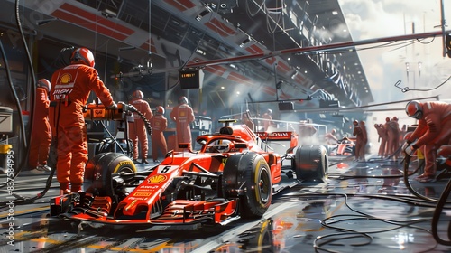The image shows a Formula 1 car in a pit stop. The car is surrounded by a team of mechanics who are changing the tires and refueling the car.