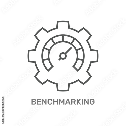 The image shows a gear with a speedometer inside, representing Benchmarking. It symbolizes evaluating performance by comparing it to standards or best practices in business and technology.