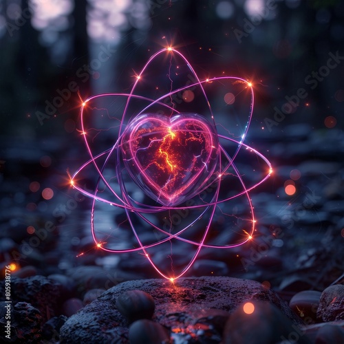 The image shows a glowing pink heart-shaped atom