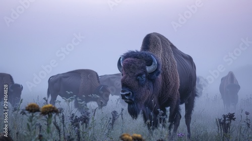 The image shows a large bison standing in a foggy field, staring at the camera.