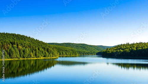 image, show, large, body, water, surrounded, tree, mountain, clear, blue, background