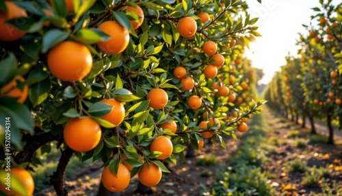 the image shows a lush grove filled with fruit bearing trees. rows of trees stretch into the distance, heavily laden with bright orange spheres nestled amongst green foliage