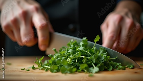 The image shows a person's hands holding a large knife and cutting a bunch of green leafy vegetables on a wooden cutting board.