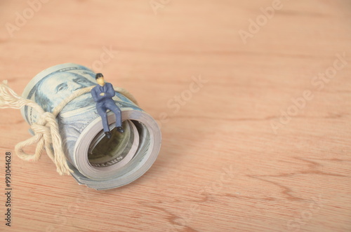 The image symbolizes the concept of financial stability and wealth, with the miniature figure perched atop a pile of money.