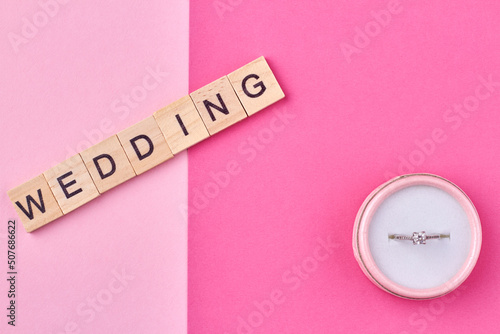 The inscription WEDDING on wooden cubes and gift box with ring. Marriage proposal concept.