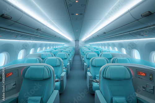 interior, large, aeroplane, blue, seat, colours, sense, airline, plane, calmness, aircraft, passenger, travel, transportation, flight, inside, almost, relaxation, air, empty, row, business, jet, cabin, tour tourism, economy, aisle, fly, class, trip, journey, chair, indoor, commercial, light, window, sky, holiday, holiday maker, comfortable