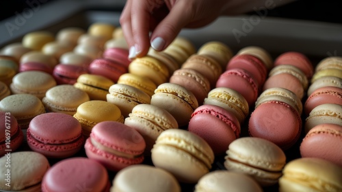 The intricate process of making French macarons, revealing the delicate dessert artistry. French macarons, dessert, pastry art, baking, delicate, French cuisine
