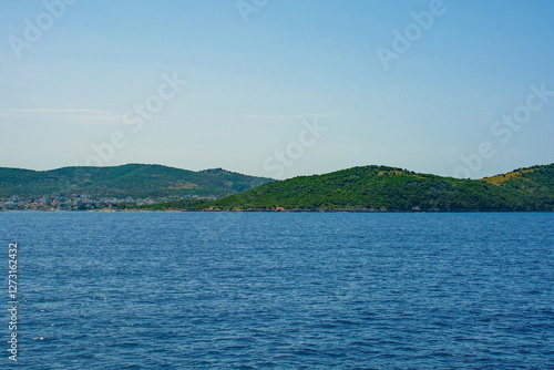 The Ionian coastline near Ksamil, part of the Albanian Riviera. Here, the green hills of the Ceraunian mountain range meet the Straits of Corfu in the eastern Mediterranean Sea