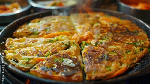 The Korean dish Jeong is pancakes with thinly sliced meat, seafood and vegetables.