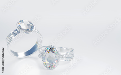 The large diamond is surrounded by many diamonds on the ring made of platinum gold placed on a gray background. Elegant wedding diamond ring for women. 3d rendering