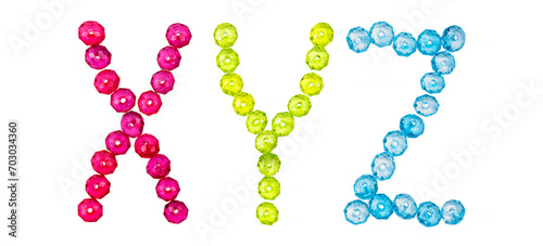 the letters of the English alphabet are laid out from colored beads on a white background, the alphabet