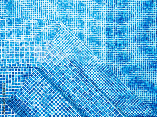 The light reflected on the top of the water surface of the pool lined with blue mosaic tiles below. Water ripples on blue-tiled swimming pool background.
