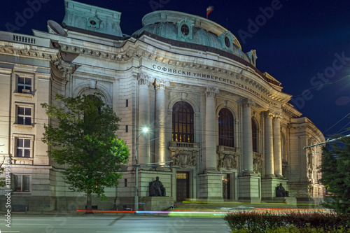 The lights of cars passing in front of University of Sofia, Bulgaria