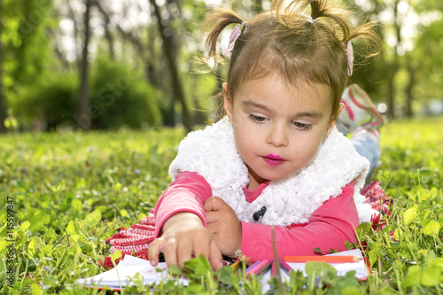 children, creativity, offspring, blanket, carefree, casual clothes, childhood, colouring, wax crayons, cute, day, dress, environment, fun, girl, grass, happiness, horizontal, avocation, lifestyle, lying down, nature, notepad, one person, outdoors, people, photo, portrait, public park, relaxation, season, small, smiling, springtime, writing, youth culture