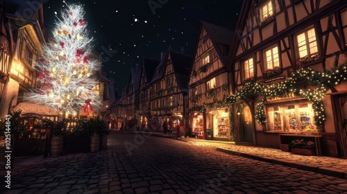 christmas, holiday, decoration, winter, town, light, tree, night, snow, festive, architecture, street, celebration, cosy, warmth, market, tradition, rural, season, joy, charme, scenic, peaceful, illuminated, village, nostalgia, gathering, seasonal