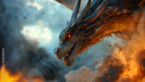 dragon, fire, smoke, flying, legendary, flames, battle, fierce, fantasy, creature, mythical, reptile, scale, wing, fiery, powerful, sky, glowing, beast, eye, sharp, teeth, danger, majestic, heat, wild, dramatic, intense, cloud, background, orange, ash, burning, myth, mediaeval, storytelling, epic, atmospheric, cinematic, adventure, magic, roar, flight, imaginary, action