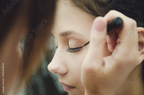The make-up master paints the eyes of the girl. Makes makeup, close-up.