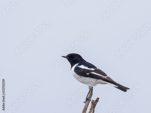 The male Hooded Robin (Melanodryas cucullata) is a medium-large black and white bird with a rather short slender bill and a moderately long tail.