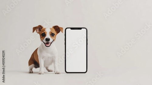 The mammal stands next to a cell phone with a white screen to convey a message and can be used for product mockups and advertising.
