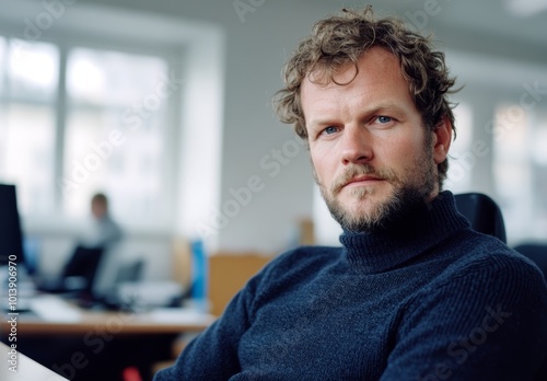 man, curly hair, beard, office, contemporary, workspace, modern, thoughtful, daylight, computer, equipment, lighting, casual attire, portrait, clothing, expression, technology, business, atmosphere, indoor, adult, male, sharpened, professional, environment, furniture, desk, serious, communication, creativity, team, design, innovative, lifestyle, human, sitting, relaxed, wearing, turtleneck, profile, work, grooming, attire, hair, employee, office worker, ambience