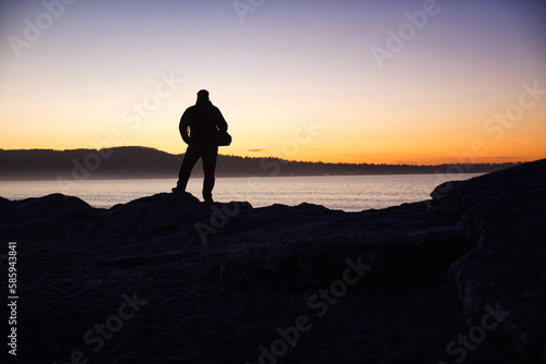 The man at sunset on the background to the ocean coast