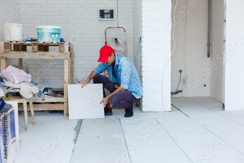 The master puts ceramic tiles on the floor