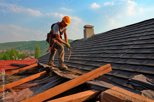 The master repairs the roof tiles of the house. Roofing, repair and renovation work. Generative AI