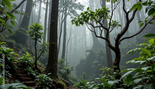 mist, leaf, branch, creating, sense, mystery, enchantment, you, wander, through, damp, humid, rainforest