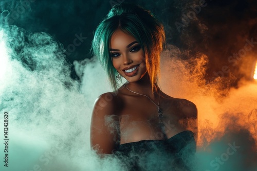 female, woman, green, hair, eye, teeth, dental, beauty, skin, cosmetic, face, smile, dark, background, portrait, care, clean, health, posing, procedure, mouth, generative, model, white, ai, fresh, closeup, correction, beautiful, whiten, natural, pretty, make-up, young, happiness, black