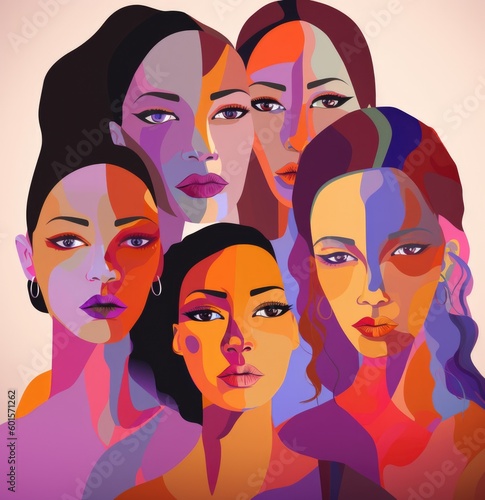 The modern woman. Grid of five different brown female faces looking at the camera, in a vector style illustration. Bright colours, fashion style illustration