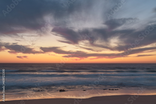 the moment after a beautiful sunset over a beach with pink clouds, Atlantic Ocean, Morocco, Tanger