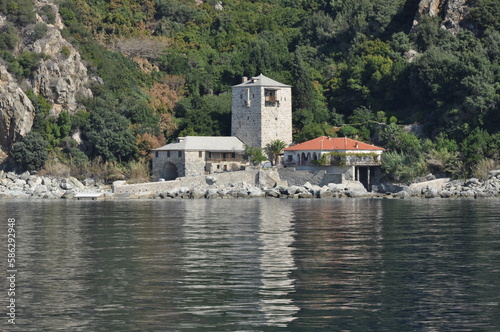 stone, building, view, history, beach, mediterranean, holy, fortress, orthodox, temple, island, monastic, ancient, mount, mediaeval, religion, athos, church, greece, architecture, monastery, coast, mountain, sea, cloister, forest, orthodoxy, historic, god, castle, pilgrimage, byzantine, pray, faith, chapels, spirituality, abbey, culture, christianity, byzantium, museum, aegean, christian, seascape, monastic