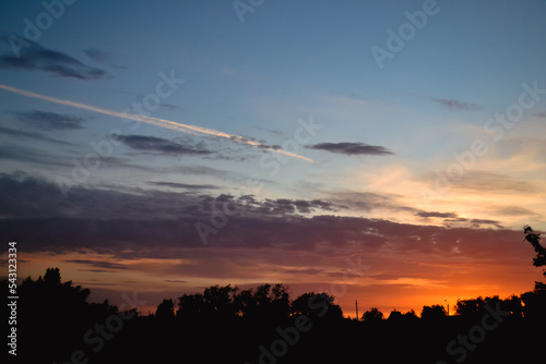 sky, cloud, dawn, tree, silhouette, sunrise, orange, blue, yellow, background, foliage, light, sunlight, morning, summer, sunny, crown, landscape, beautiful, travel, nature, colourful, bright, black, leaf, treetop, vibrant color, sun, idylli, calm, copy space, horizon, height, glow, harmony, radiant, scenery, shadow, high-coloured, warm, weather, cloudscape, colourful, aethereal, air, atmosphere, heaven, peaceful, pillar