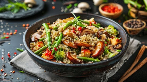 The national cuisine of Japan. Warm salad of quinoa, mushrooms, asparagus and beans with teriyaki sauce.