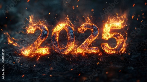 The number "2025" engulfed in realistic flames, with sparks flying in every direction. The numerals appear metallic, glowing from the heat, with ember particles floating around. Use a dark, smoky