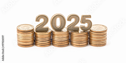 The numbers "2025" over a pile of coins, isolated on a white background