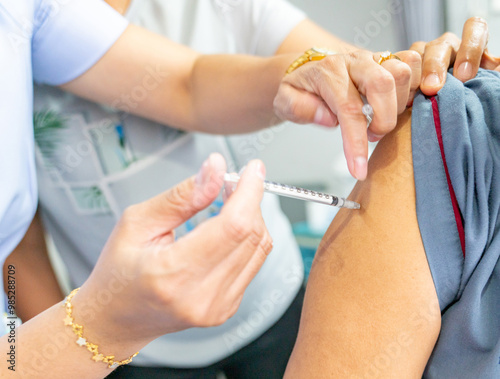 The nurse administers the injection to the patient.