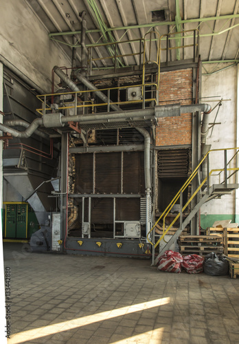 boiler, coal, construction, crash, demolition, dirt, dirty, fitting, fragment, grille, heater, heating, industry, installation, insulation, interior, iron, metal, pipe, railing, rust-eaten, sheet, stair, technology, vault, wall, yellow