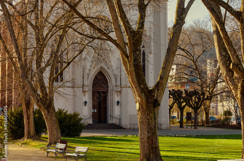 The old German city of Bad Ems. Park in front of the cathedral, trees.