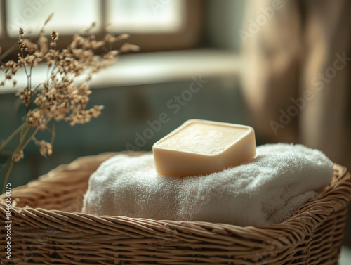 the organic soap on the fresh new white towel in the basket in farmhouse airbnb rental